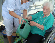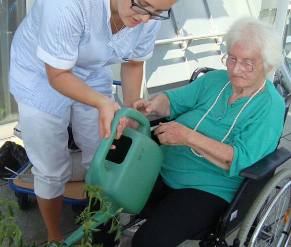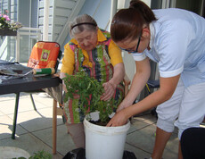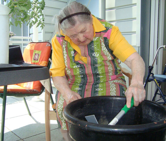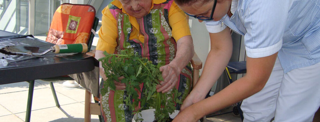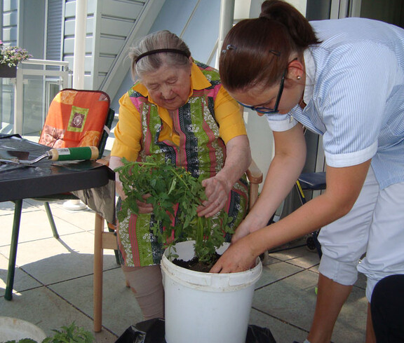 Paradeiserpflanzen und eine Sonnenblume ein. Zusammen wurden die Töpfe mit Blumenerde gefüllt und anschließend die Pflanzen eingesetzt. Damit die Pflanzen das heiße Wetter auch überstehen, wurden sie noch fest eingegossen. Danach wurde noch der ideale Platz für die neu getopften Paradeiser gesucht. Die Bewohnerinnen hatten bei der abwechslungsreichen Arbeit viel Freude und haben uns Tipps für die Pflege des Gemüses gegeben. Nach getaner Arbeit erfrischten wir uns mit einem kühlen Getränk.