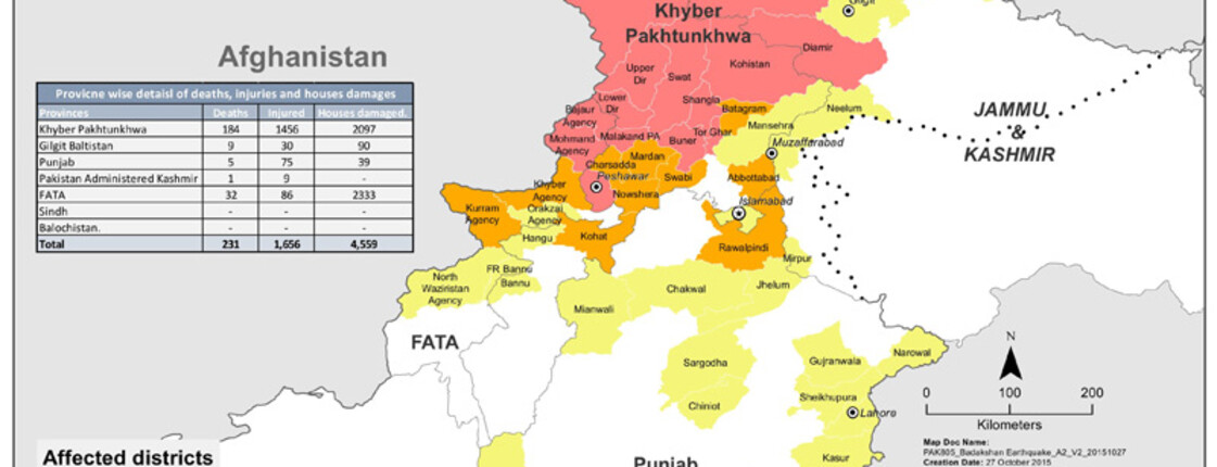 Am 26.10.2015 erschütterte ein Erdbeben der Stärke 7,5 die Hindukusch Region - betroffen sind vor allem Afghanistan und Pakistan, aber auch Indien und Tadschikistan. Die Zahl der Toten liegt nach offiziellen Angaben derzeit bei über 400, mehr als 2.000 wurden verletzt. Nur wenige hundert Kilometer vom Erdbebenzentrum nahe der Stadt Dschurm in Afghanistan entfernt kostete ein Erdbeben derselben Stärke vor 10 Jahren 75.000 Menschen das Leben.
