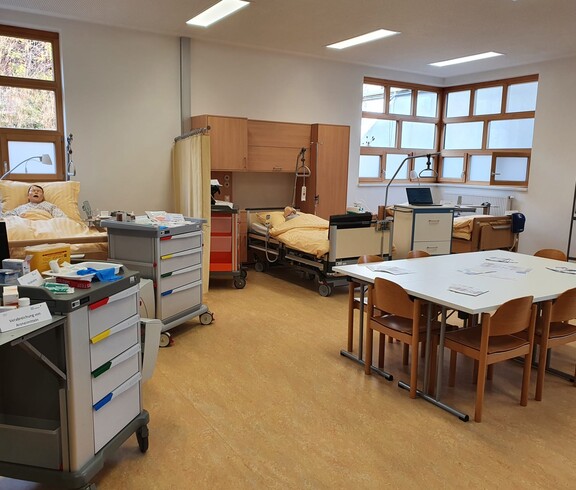 Besonders beeindruckt zeigten sich viele vom neuen mulitfunktionalen Pflegelehrsaal. Die Ausstattung und Einrichtung dieses Pflegelehrsaales entspricht dabei modernen Ausbildungsstandards, Geräte wie Notfallwagen, Lifter, Klink- und Pflegebetten wie auch der gesamte Sanitärbereich bieten praxisnahe Lernbedingungen. Dabei wurden neueste Produkte angekauft, wie sie derzeit in Kliniken, Pflege-, Förder- und Betreuungseinrichtungen ihre Anwendung finden. Das Raumangebot bietet genügend Flexibilität um vom theoretischen Unterricht spontan ins praktische Training zu wechseln.
