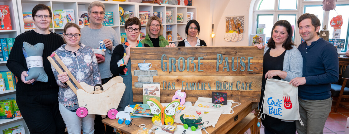 Kreative Produkte der Caritas Tagesstatte Paudorf gibt es jetzt auch in der Großen Pause in Langenlois. Im Sgrafitto-Haus am Kornplatz ist seit Herbst das große FamilienBuchCafe untergebracht. Anita Zeilinger-Pferscher, die Leiterin der Caritas Tagesstätte für Menschen mit psychischen Erkrankungen in Paudorf (5.v.l.), freut sich über die Kooperation mit der Großen Pause. Angeboten werden Holzspielzeug, Nützlingshäuser und auch ein Leseknochen, ein Polster für gemütliche Stunden. Die Betreiber der Großen Pause, Christina Pachschwöll (4.v.l.) sowie Sevgi und Gerfried Weingartner (r.) freuen sich über die neuen Angebote. Mit einem Holz-Firmenschild überraschten Caritas-Tischlerin Nesrin Anissin und die Tagesstätten Mitarbeiterinnen Ilona Hahnl mit dem Leseknochen, Andrea Schachinger mit dem Puppenwagen und Martin Salz die Gründer und Betreiber der Großen Pause. - Ein gelungenes Beispiel einer sozialökonomischen Zusammenarbeit.