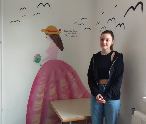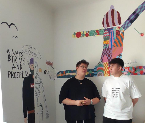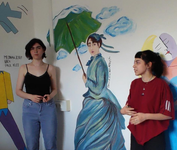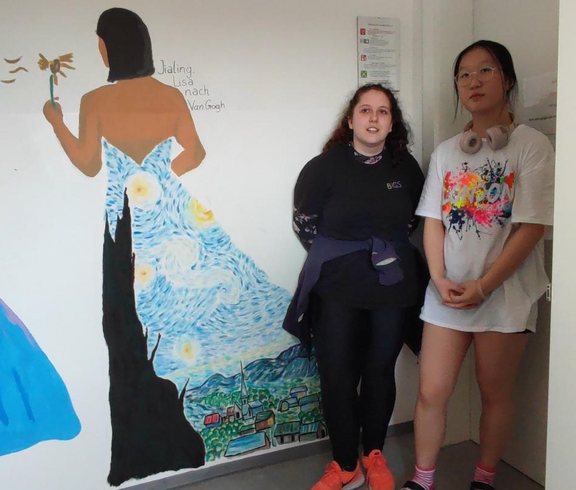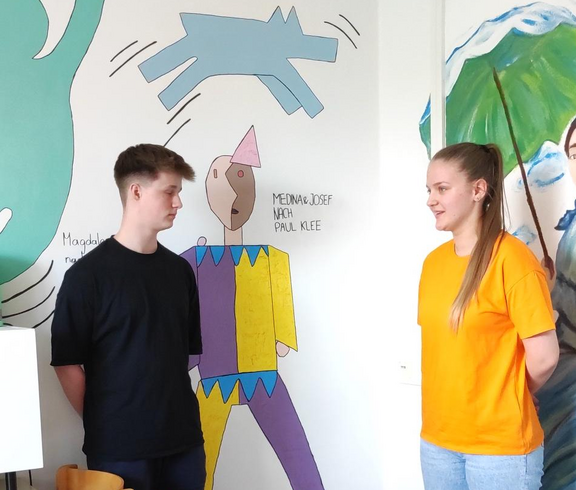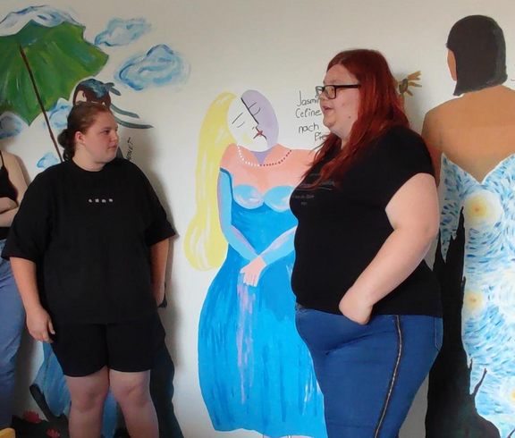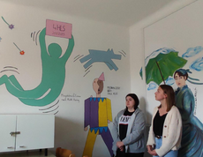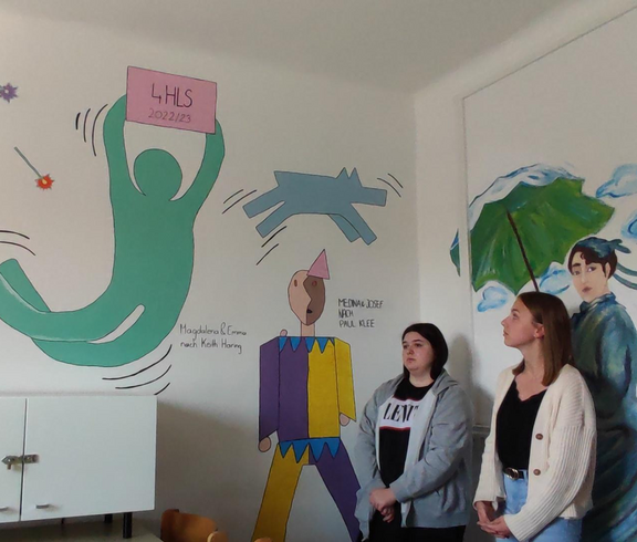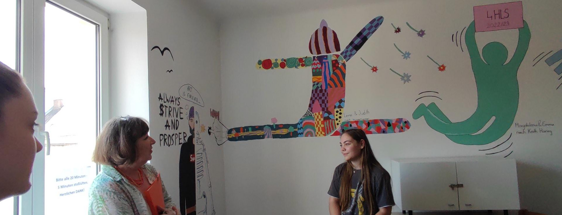 Die 4HLS hat im Rahmen ihres KREA Unterrichts unter der Leitung von Prof. Kisling ein Projekt zur Gestaltung des Sozialraumes umgesetzt. Im Lehrplan ist vorgegeben ein Projekt mit sozialen Aspekten in der Gruppe umzusetzen. Die Schüler wünschten sich den Sozialraum gestalten zu dürfen um auch selber von der Gestaltung profitieren zu können. Ein Thema wurde schnell gefunden und die Schüler entwickelten jeweils in Partnerarbeit eine Darstellung einer menschlichen Figur, die die Merkmale eines Malstils eines selbstgewählten Künstlers der Moderne erkennen lassen sollte. Sie sollten es schließlich auch schaffen dieses Motiv, dass mit Dispersionsfarben auf die zur Verfügung stehenden Wände übertragen wurde mit dem Nachbarmotiv in Verbindung zu bringen. Die Herausforderung lag nicht nur darin ein Motiv in Lebensgröße Freihand auf die Wand zu zeichnen und zu malen, sondern auch den richtigen Platz zu finden und eine Verbindung zum Nachbarn herzustellen. Neben künstlerischen Fähigkeiten war hier Kommunikationsfähigkeit und soziales Miteinander gefordert. Nach Wochen der Arbeit können wir mit Stolz behaupten, dass das Projekt gelungen ist und hoffentlich viele Jahre die folgenden Generationen von Schülern in ihren Pausen erfreuen wird. Wünschenswert wäre, wenn die Schüler, die den Raum nützen sich von dem Ambiente inspirieren ließen und so einen Zugang zur bildenden Kunst finden könnten.