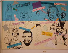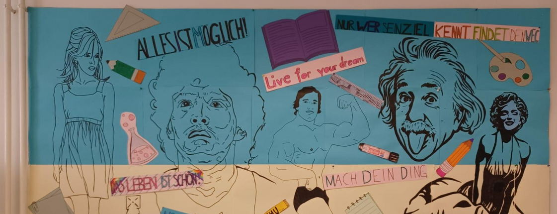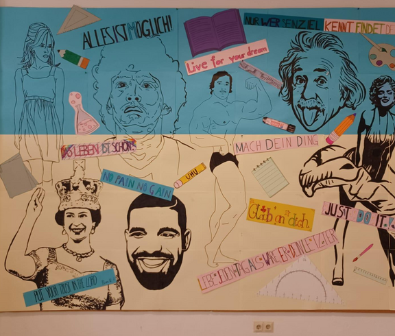 Wandbild in der Aula zur Motivation für die gesamte Schulgemeinschaft unter dem Motto: Du schaffst alles, wenn Du es willst! Die Schüler wählten Vorbilder, die um Erfolg und Anerkennung kämpfen mussten. Beteiligt waren die 1HLS, 2HLS, 2AFSB, 2BFSB! WIR WÜNSCHEN ALLEN EIN ERFOLGREICHES UND FRÖHLICHES SCHULJAHR 2023/24!