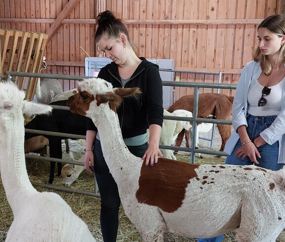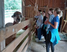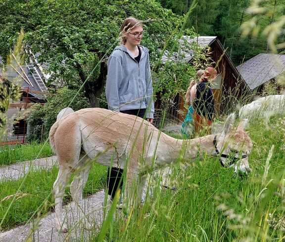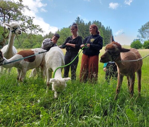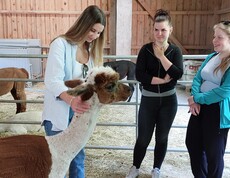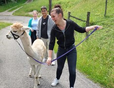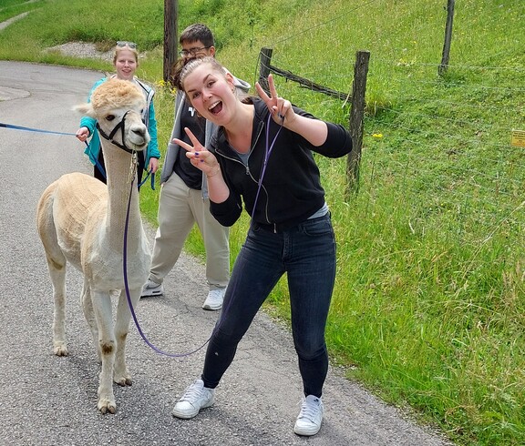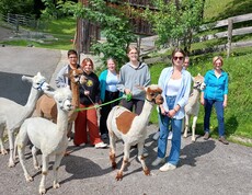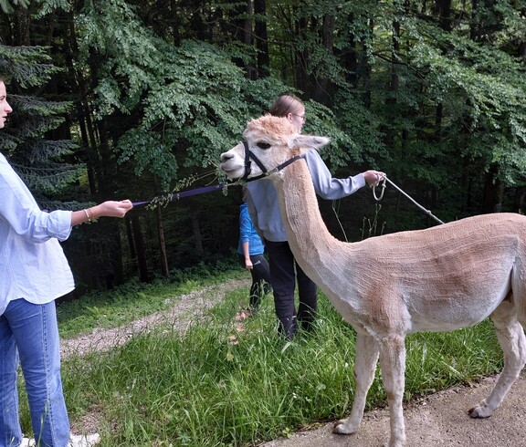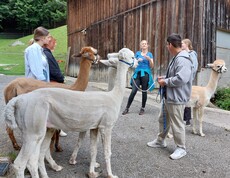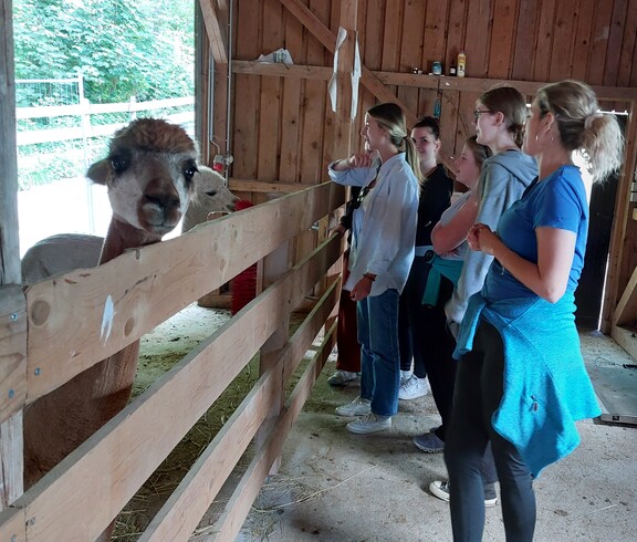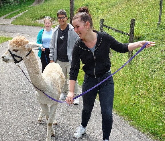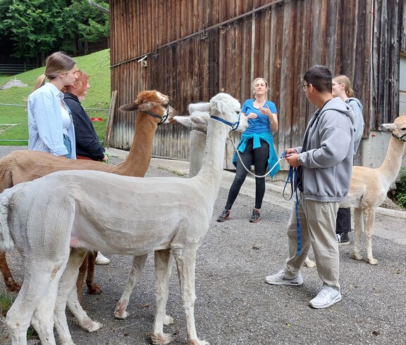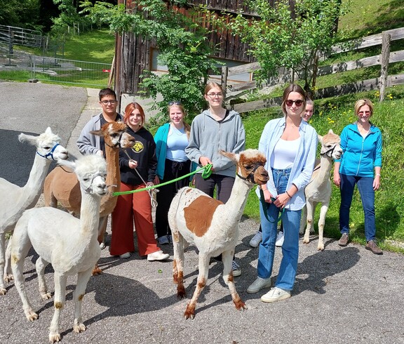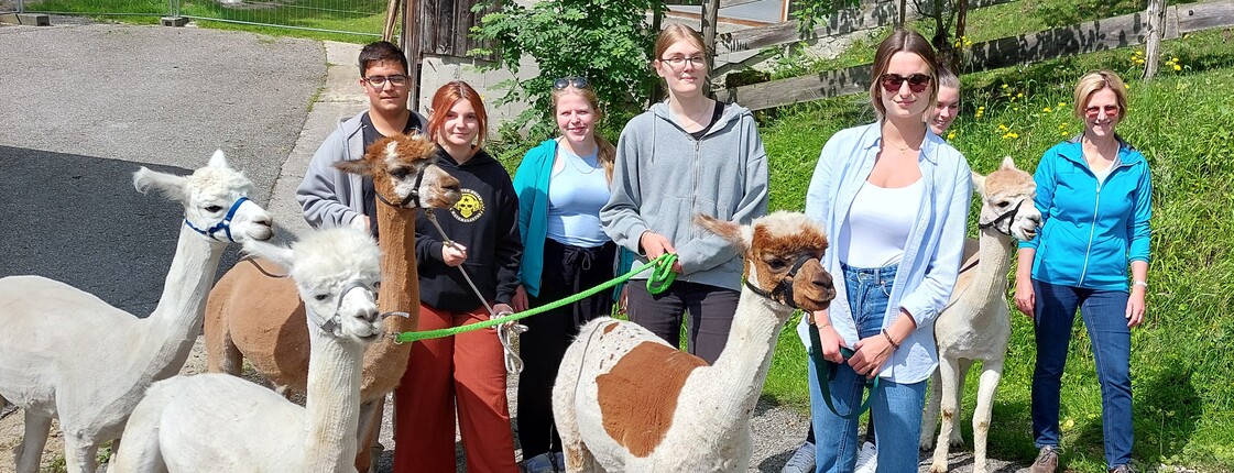 Den Alpakahof von Stefanie Ecker in Randegg besuchten unsere angehenden Diplomsozialbetreuer*innen für Familienarbeit. Eindrucksvoll stellte sie uns die Möglichkeiten zur Lebens- und Trauerbegleitung mit Alpakas vor. In einem Spaziergang mit diesen herzigen Tieren konnten prompt auch Einfühlungs- und Führungsvermögen selbst erprobt werden.