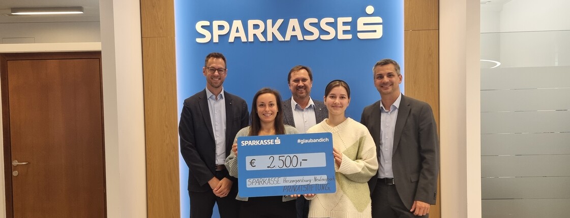 Die Spendensumme wurde im Zuge des alljährlichen Sommerfestes "Money meets Wine" am 8. August gesammelt und durch die Sparkasse Herzogenburg-Neulengbach AG auf einen Betrag von 2.500 Euro großzügig aufgerundet. Die beiden Vorstandsdirektoren Martin Groiss und Thomas Fröhlich haben nun den Scheck am 30. September an die beiden Mitarbeiterinnen des Lerncafe Magdalena Schneeweis und Simona Mandici sowie Caritasdirektor Hannes Ziselsberger übergeben.