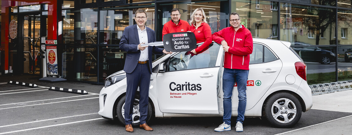 SPAR-Geschäftsführer Alois Huber hat im Rahmen eines Besuchs im SPAR Mariazellerstraße ein neues Auto für den mobilen Pflegedienst an die Caritas der Diözese St. Pölten übergeben. „SPAR ist langjähriger Partner der Caritas und unterstützt die mobilen Pflegekräfte jährlich mit einem Einsatzfahrzeug. Die Mitarbeiter*innen der Caritas sind die „Nahversorger der Nächstenliebe“ und ein wertvoller und unverzichtbarer Dienst für die Menschen in der Region“, sagt Huber.